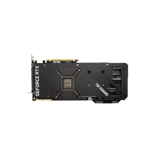 The heat spreader draws heat up into heatpipes that carry it through a fin stack that fills most of the card’s large, 2.7-slot footprint. This generation of TUF Gaming graphics cards also feature a dedicated heatsink for VRAM to keep temperatures well under maximum operating specs.